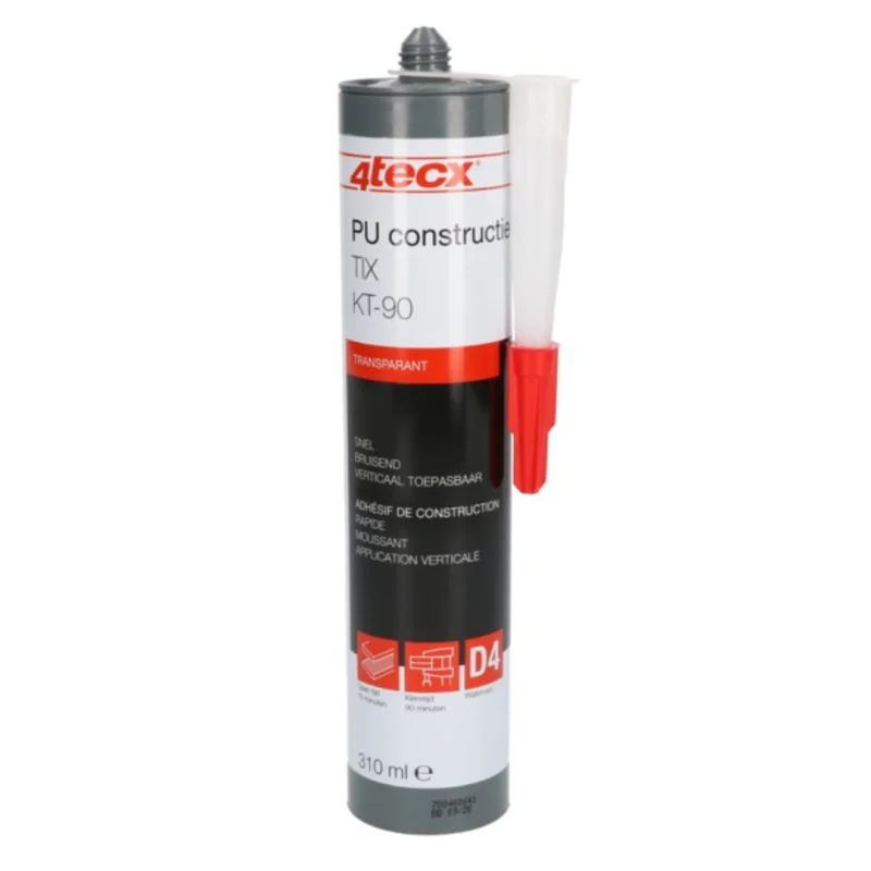 De 4tecx constructielijm TIX KT90 transparant 310 ml is een krachtige, universele montagelijm die geschikt is voor uiteenlopende constructieve verlijmingen in bouw, afbouw en montage. Dankzij de tixotrope (TIX) samenstelling druipt de lijm niet en blijft hij goed op zijn plek, ook bij verticale toepassingen. De lijm hecht snel en sterk op veel voorkomende materialen zoals hout, metaal, kunststof, steen, beton en diverse plaatmaterialen, waardoor hij breed inzetbaar is voor zowel professioneel gebruik als doe-het-zelfklussen.De transparante uitharding zorgt voor een nette, vrijwel onzichtbare afwerking, wat deze lijm ideaal maakt voor zichtwerk en precisietoepassingen. De KT90 combineert hoge eindsterkte met een betrouwbare aanvangshechting, zodat onderdelen snel gefixeerd zijn en je efficiënt kunt doorwerken. De 310 ml koker is geschikt voor standaard kitpistolen en eenvoudig te doseren, wat zorgt voor gecontroleerd en schoon werken.