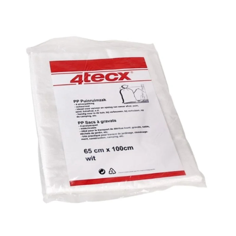 Deze 4tecx puinruimzakken van geweven polypropyleen (PP) zijn ideaal voor het verzamelen en afvoeren van puin, bouwafval, zand en tuinafval. Dankzij het sterke geweven materiaal (60 g\\\\/m\\\\u00b2) zijn de zakken scheurvast en geschikt voor zwaardere toepassingen op de bouwplaats of bij renovatiewerkzaamheden. Met een afmeting van 65 x 100 cm en een inhoud van circa 95 liter bieden de zakken voldoende ruimte voor diverse afvalstromen. De zakken zijn licht van gewicht, eenvoudig te hanteren en worden geleverd per 4 stuks.