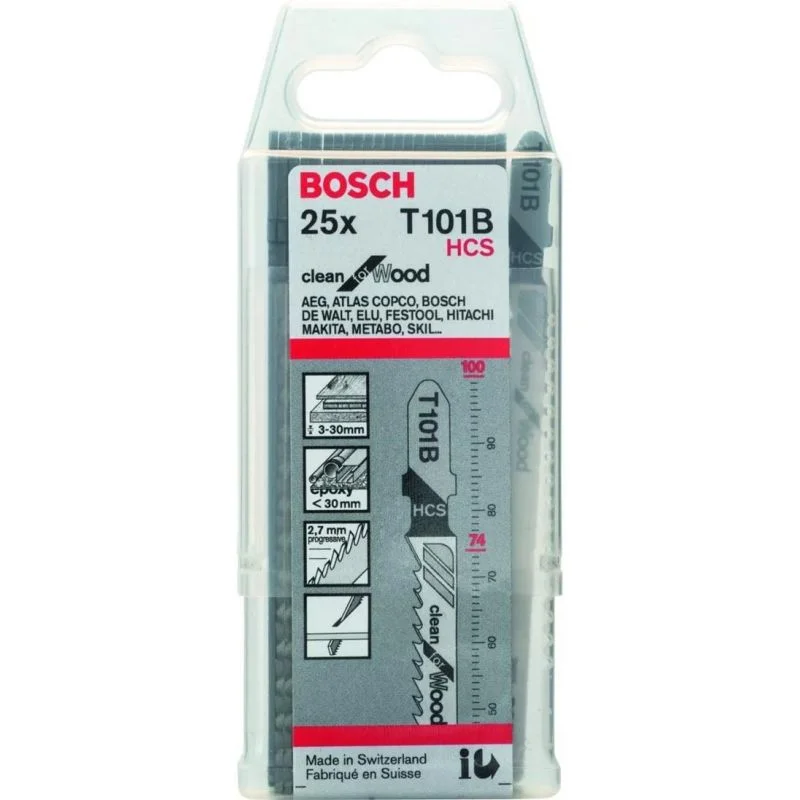 Dit Bosch decoupeerzaagblad is geschikt voor rechte zaagsneden in hard hout. De precisiegeslepen tanden met taps geslepen lichaam snijden zuiver. Ook is de tandbalk van gehard HSS (hogesnelheidsstaal) en BIM (bi-metaal) versterkt met zeer elastisch koolstofstaal, waardoor het blad harde materialen kan zagen. Deze t101b is 100mm lang en wordt per 25 stuks verkocht.