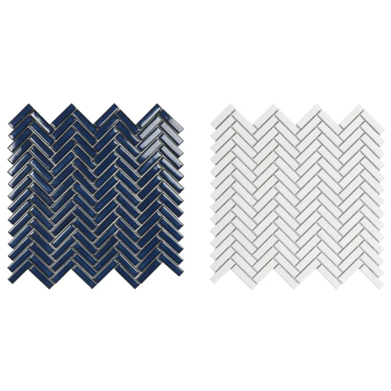 Deze wandtegel in Chevron-patroon van Intermatex is perfect voor wie durft. Kies voor diepblauw voor een statement of ga voor wit voor een rustige, verfijnde uitstraling.