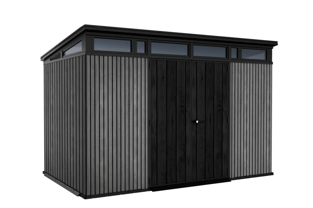 Met zijn strakke lijnen, ingebouwde ramen en aflopend dak, is dit tuinhuis een stijlvolle aanwinst voor elke tuin.