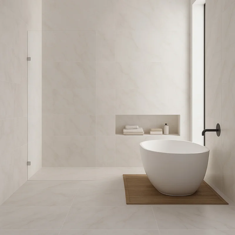 De Wiesbaden profielloze douchewand past perfect in serene badkamerontwerpen waar rust, licht en eenvoud centraal staan. Dankzij de variatie in breedtes pas je hem eenvoudig aan op jouw ruimte \\u2013 van compact tot royaal. Perfect te combineren met zachte natuurtinten, betontegels of een vrijstaand bad zoals op de afbeelding.