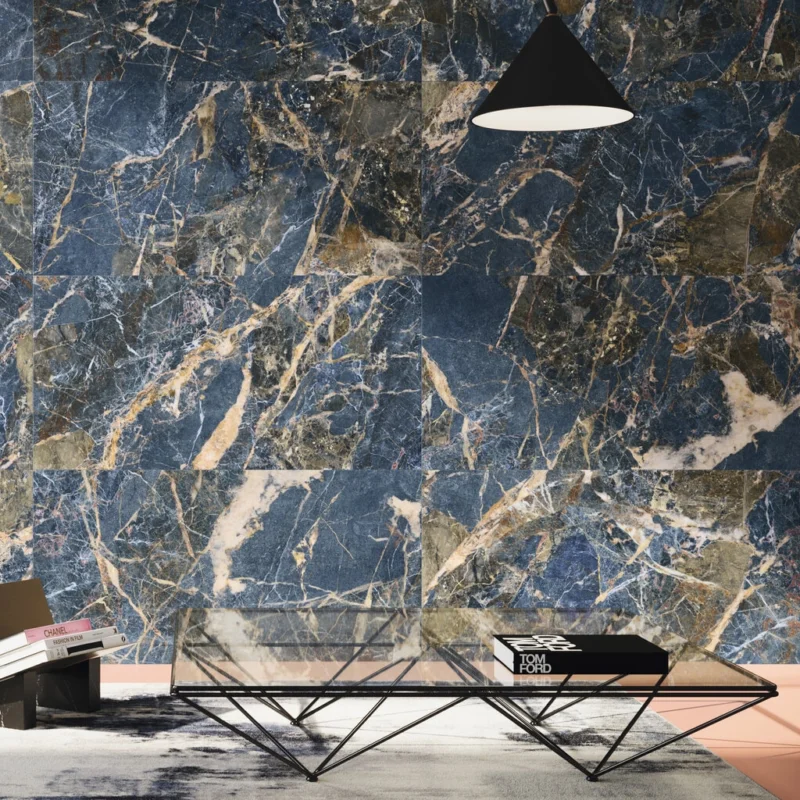 Door de ongewone, intense blauwe tint, welke is geïnspireerd op het blauwe mineraal Sodaliet, is deze marmerlook tegel uiterst geschikt in een luxe badkamer. Deze tegel is te bezichtigen in onze showroom.