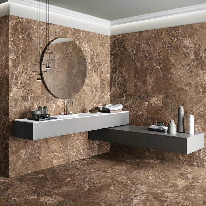 Het verfijnde oppervlak van de Imperial Brown tegel zorgt voor een gevoel van diepte en verfijning. De levendige aders geven elke ruimte een uniek karakter, waardoor deze tegel perfect past binnen zowel moderne als klassieke interieurs. Denk aan een chique badkamer, een warme woonkamer of een luxe keuken.