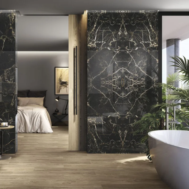 De intense zwarte kleur en de onregelmatige bruine en witte aderen zorgen voor krachtige, maar elegante uitstraling. Deze tegel is in onze showroom te bezichtigen in 60×120.