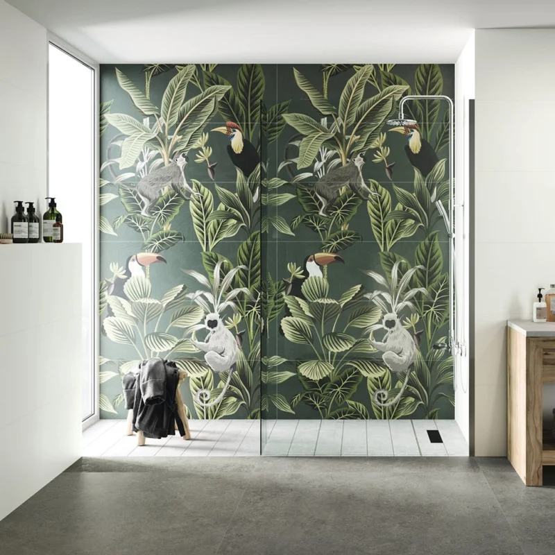 Creëer je eigen Jungle op het toilet of in je badkamer met deze behanglook tegels. Tegels zijn gemakkelijk af te nemen en kunnen verwerkt worden in natte ruimtes. DEZE TEGELS ZIJN IN ONZE SHOWROOM TE BEZICHTIGEN.