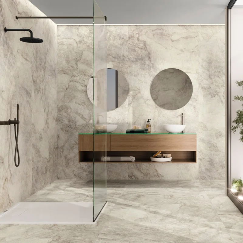 De Taj Mahal tegel is een verfijnde marmerlook tegel geïnspireerd op de majestueuze uitstraling van het wereldberoemde monument Taj Mahal. Deze tegelcollectie vertaalt de luxe en harmonie van dit architectonische meesterwerk naar een stijlvolle oplossing voor moderne interieurs.
