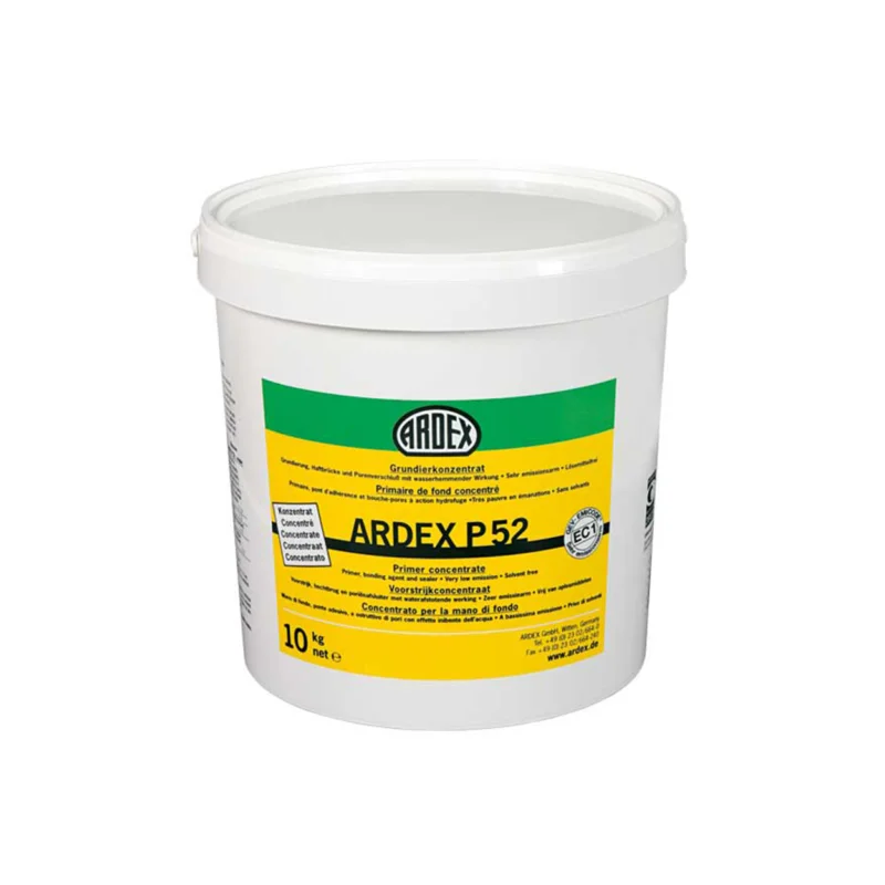 ARDEX P 52 READY is een gebruiksklare primer voor zuigende ondergronden zoals cementdekvloeren en calciumsulfaatvloeren. Deze grondering bindt stof, sluit poriën af en voorkomt luchtinsluiting bij egalisatie. Ideaal als voorbereiding op ARDEX-vloeregalisatieproducten.