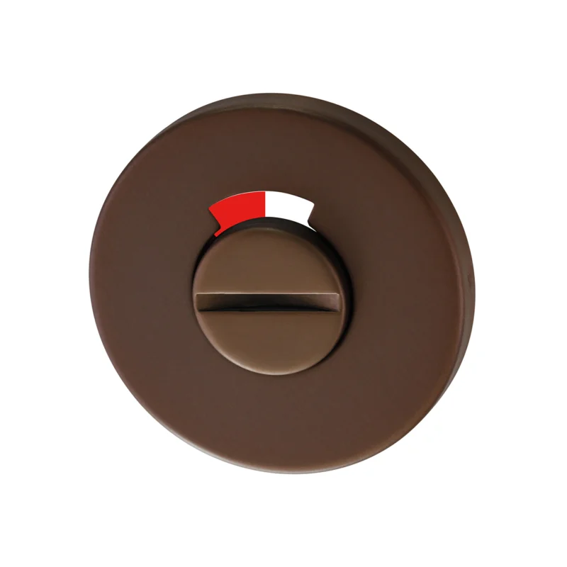 Deze toiletset in mat brons is uitgerust met een draaiknop en vrij/bezet aanduiding. De \\u00D8 54 mm rozet zorgt voor een solide en stijlvolle montage op toilet- of badkamerdeuren. Perfect als je jouw interieur een warme, luxe touch wilt geven.