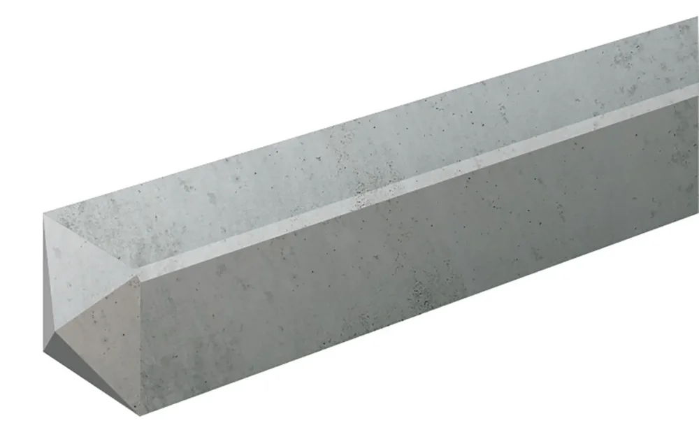 Lichtgrijze beton paal Basis Serie met aan de onderzijde 2 sleuven om de onderplaat in te monteren. In de betonpaal zitten reeds gaten voorgeboord. De betonnen schuttingpaal is 10 x 10 cm en 180 cm lang. Deze tuinpaal is lichtgrijs van kleur, ongecoat en heeft bovenop een moderne diamantkop.