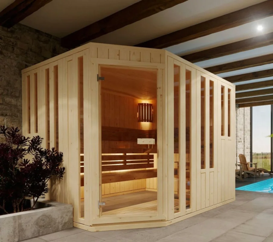 Met de Nurkka sauna haal je een sfeervolle hoeksauna in huis die dankzij het hoekontwerp efficiënt gebruikmaakt van de ruimte. Deze massieve Finse binnensauna van vurenhout heeft stevige wanden van 45 mm dik die zorgen voor een aangename warmte en een duurzame constructie. Het vele glas en de glazen deur zorgen voor veel lichtinval en geven de cabine een open, moderne uitstraling die perfect past in een eigentijds interieur. Zo combineert de Nurkka comfort, design en ruimtebesparing in één stijlvolle sauna.