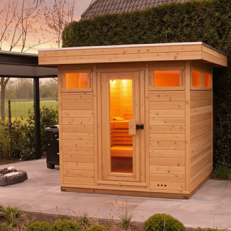 Met de Noor haal je een moderne buitensauna naar je tuin die draait om functionaliteit en ontspanning. Deze Finse sauna is opgebouwd uit massief vurenhout en verkrijgbaar in twee wanddiktes. De ramen zorgen voor natuurlijke lichtinval en geven de cabine een open uitstraling. Binnen vind je banken die voldoende ruimte bieden om comfortabel te ontspannen, of je nu rechtop zit of languit wilt genieten. De Noor is een fijne keuze als je houdt van rust, eenvoud en het pure buitengevoel.
