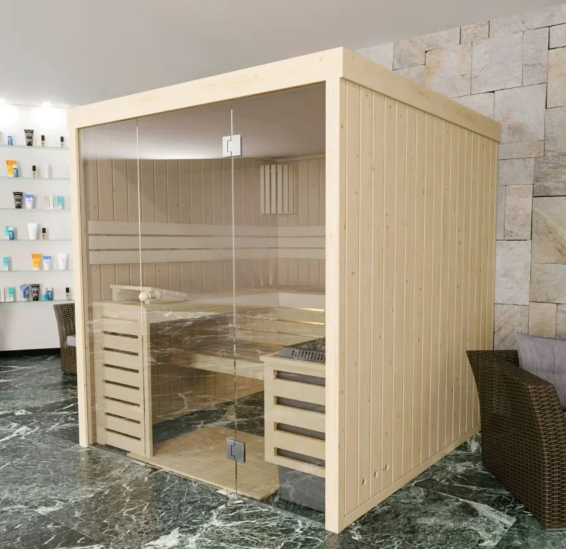 De Rio Glass is een moderne massieve binnensauna met een open en lichte uitstraling dankzij het royale gebruik van glas. Deze Finse sauna van vurenhout heeft stevige 45 mm dikke wanden en wordt geleverd in elementen die je makkelijk zelf monteert. Je hebt keuze uit verschillende indelingen en maatwerk is ook mogelijk, zodat de sauna altijd perfect aansluit bij jouw ruimte en wensen. De combinatie van glas en hout zorgt voor een strak ontwerp met een warme sfeer.