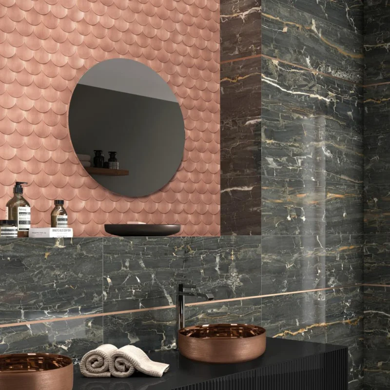 Metallic mozaïektegel, 30×20 cm groot, in een koperkleur die doet denken aan de staart van een zeemeermin. SIRENA is geïnspireerd op de mariene mythologie en is een metalen mozaïektegel waarvan de schittering elke kamer waarin hij wordt geplaatst zal opfleuren. Dune Sirena Copper wordt per matje verkocht. Deze tegel is in de showroom te bezichtigen.