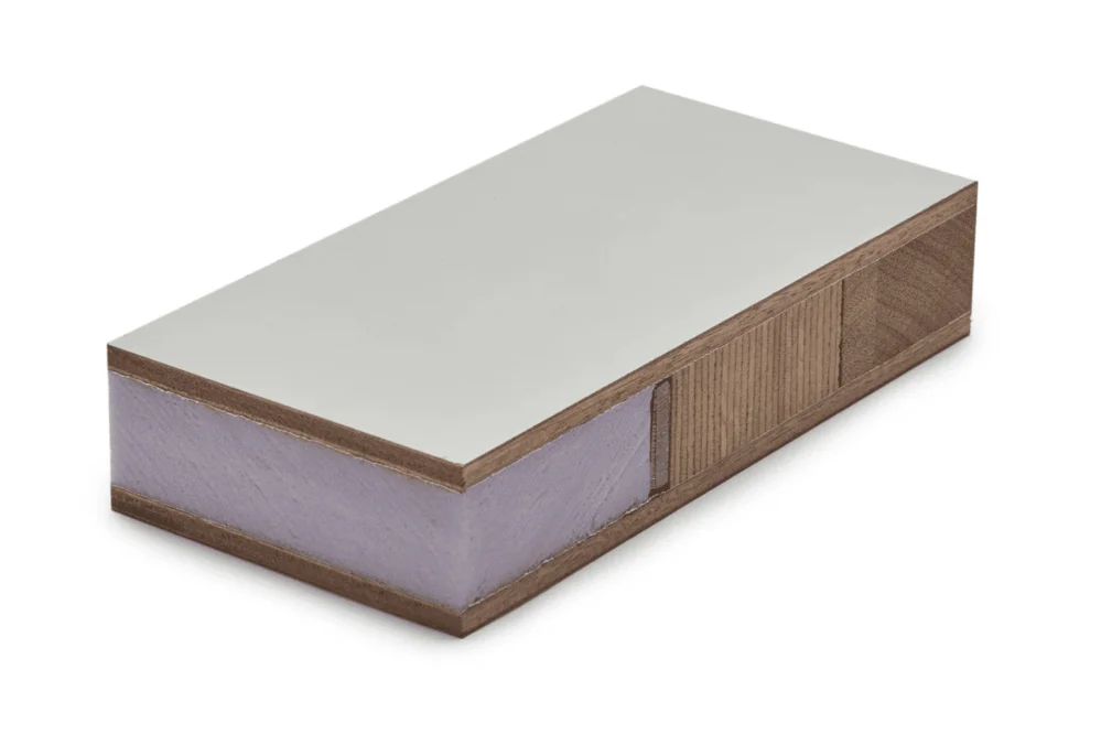 De opbouw van de plaat is zorgvuldig samengesteld. Aan de buitenzijden zit 6 mm massief okoumé, met daaronder een aluminium vochtscherm. De kern bestaat uit XPS-schuim, dat zorgt voor een hoge isolatiewaarde. Voor extra stabiliteit is er een laag LVL (Laminated Veneer Lumber) toegevoegd, samen met stroken massief hardhout voor een goede schroefvastheid.