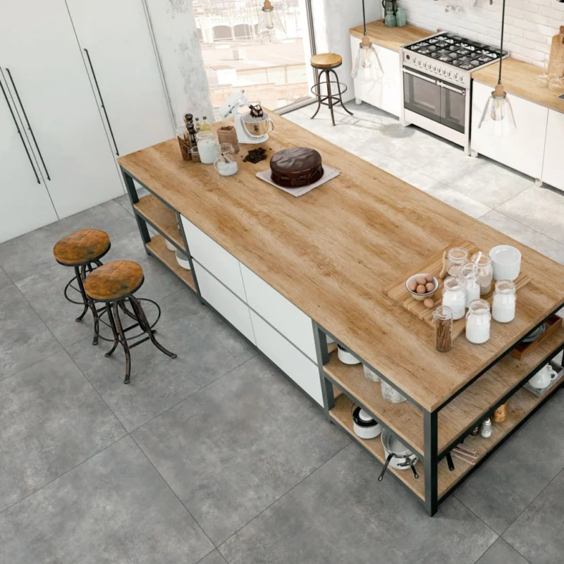 La Fabbrica – AVA combineert in de serie Skyline de sobere textuur van beton met natuurlijke texturen, verdund door bleke tinten in dezelfde kleur die het uiterlijk verzachten.