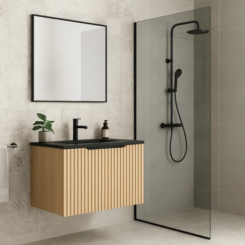 Breng luxe en karakter in je badkamer met het Ribbella badmeubel. Het verfijnde geribbelde design geeft dit compacte meubel een elegante uitstraling, terwijl de matzwarte kunstmarmeren wastafel en subtiele zwarte details zorgen voor een moderne, stoere look. Perfect voor wie houdt van stijl, zonder in te leveren op functionaliteit.
