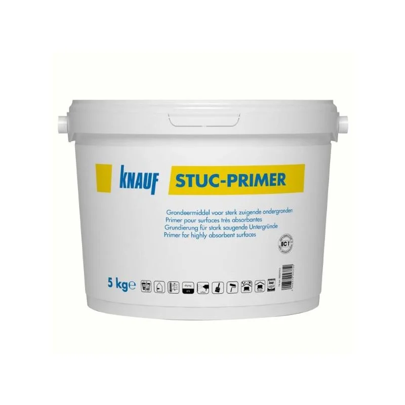 Deze emmer Knauf Stuc-Primer heeft een inhoud van 5 kg. Knauf Stuc-Primer is een voorstrijk die je binnen kunt gebruiken voor een goede hechting voor gipspleister op een sterk of onregelmatig zuigend, steenachtige ondergrond. Knauf Stuc-Primer vermindert de zuigende werking van de ondergrond. Verdun de stuc-primer met water 1\\\\/1 tot 1\\\\/3 en gebruik ongeveer 100 gr\\\\/m\\\\u00b2 onverdund.