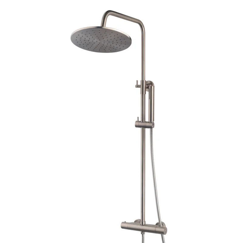Strak, mat en modern: deze douche-opbouwset in geborsteld staal is een blikvanger in je badkamer. De set biedt alles wat je nodig hebt voor dagelijks douchecomfort \\u2013 inclusief thermostatische kraan, handdouche en hoofddouche. Stijlvol én functioneel.