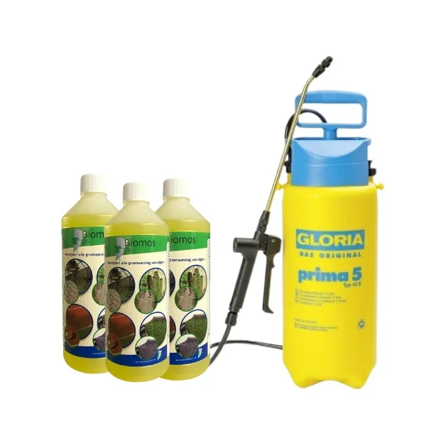 Met deze Biomos set ben je klaar om de strijd aan te gaan met groene aanslag en alg. De set bestaat uit 3 x 1 liter Biomos en een drukspuit van 5 liter. Bestel het snel en eenvoudig bij Steenvoordeel.