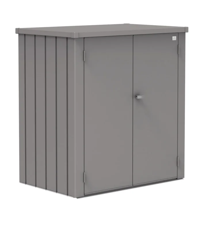 Deze Romeo terraskast is gemaakt van vuurverzinkt, polyamide emailgecoate staalplaten. Dat houdt in dat het staal eerst in een thermisch bad is ondergedompeld voor een zinklaag en hierna aan beide zijden voorzien van een voorbehandeling, grondlaag en uiteindelijk een polyamide emailcoat om hem op kleur te krijgen. Corrosie krijgt hierdoor geen kans.
