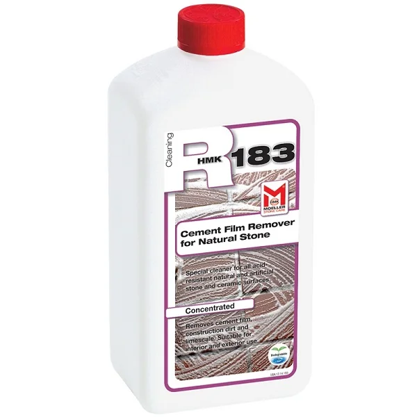 HMK R183 Cementsluier-Ex voor zuurbestendig natuursteen is een speciaal reinigingsmiddel (geconcentreerd). Het verwijdert vuil, cementsluier en kalkafzettingen van alle typen niet zuurgevoelige oppervlakken, van natuursteen, kunststeen, tegels, porcelanato, klinkers, kwartscomposiet en ruw beton, zowel binnen als buiten.