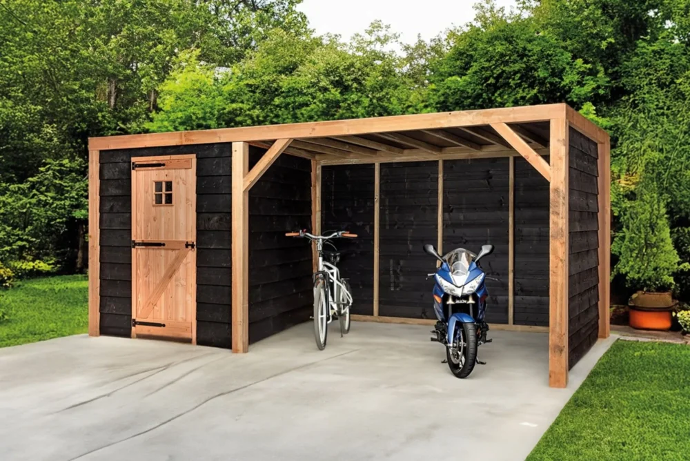Ben je op zoek naar een houten schuur met een flink overkapt deel en in een modern zwart jasje voor een betaalbare prijs? Dan is de tuinberging Hidde de ideale keus voor jou. Hij is flink ruim en herbergt daardoor voldoende ruimte om veel spullen in kwijt te kunnen. Denk bijvoorbeeld aan fietsen, tuingereedschap, een grasmaaier, etc.