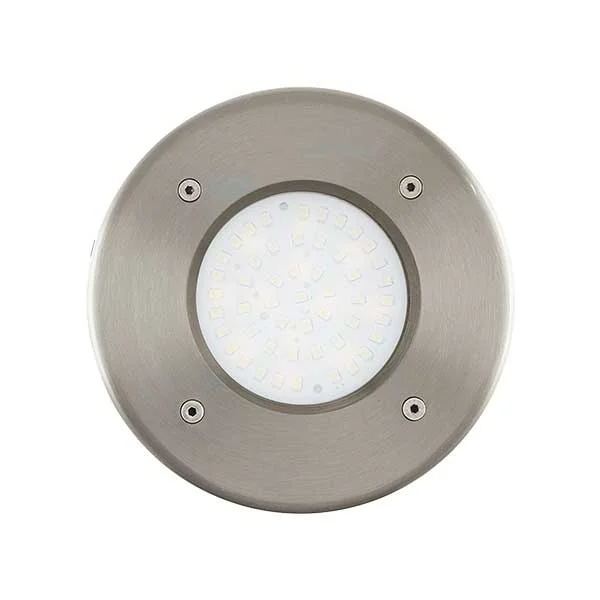 De LAMEDO LED inbouw grondspot rond RVS voor buiten heeft een ronde behuizing van roestvrij staal met een diameter van 100 mm en een lichtpaneel van wit gesatineerd glas.