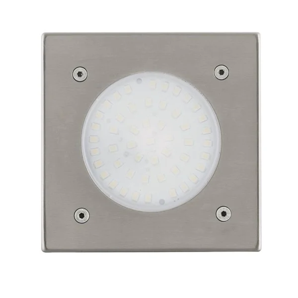 De LAMEDO LED inbouw grondspot vierkant RVS voor buiten heeft een vierkante roestvrijstalen behuizing van 100×100 mm en een rond lichtpaneel van wit gesatineerd glas.