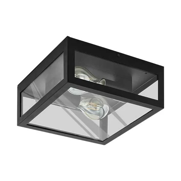 ALAMONTE plafondlamp 2xE27 zwart/glas heeft een metalen frame met heldere glazen panelen waarin de gloeilampen zijn geplaatst.