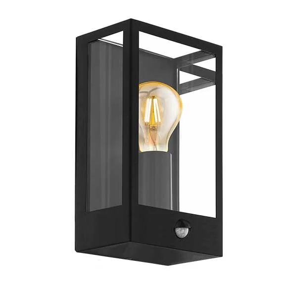 ALAMONTE wandlamp zwart E27 met sensor heeft een metalen frame met heldere glazen panelen, wat zorgt voor een zichtbaar gloeilampontwerp.