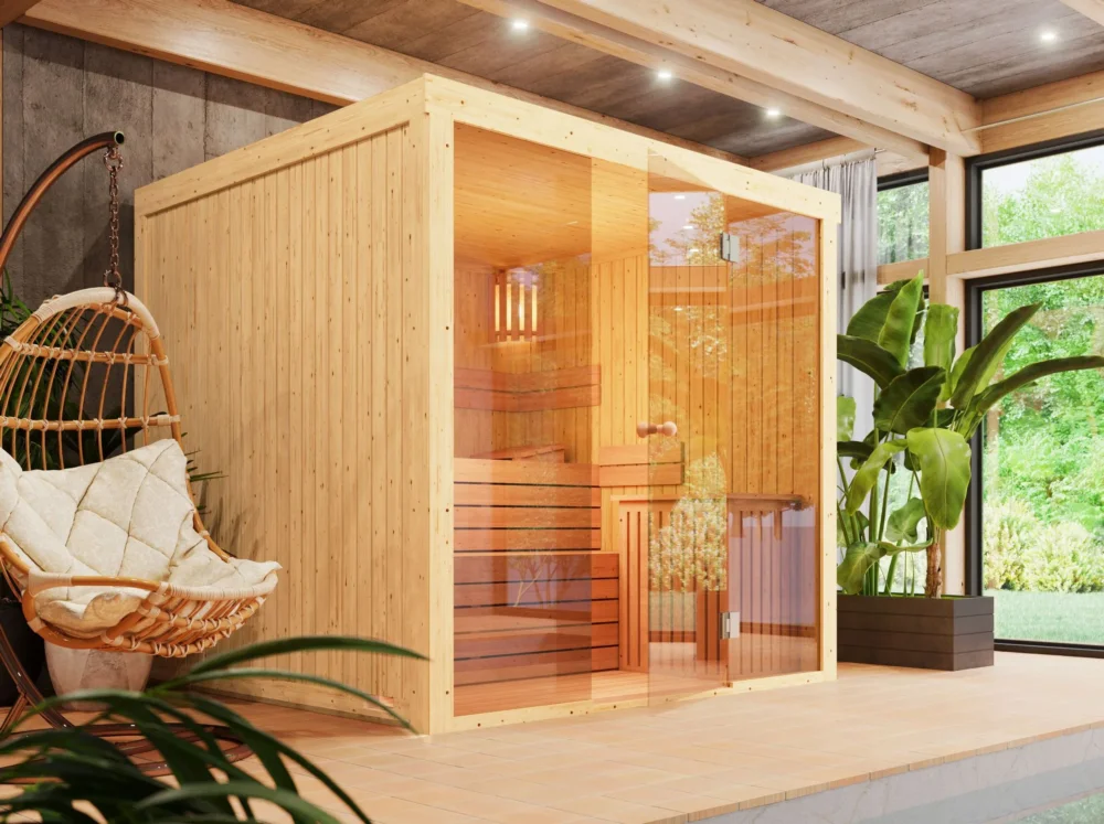 Met de Lumen haal je een elegante en lichte binnensauna in huis die direct opvalt door de royale glaswand aan de voorzijde. De stevige wanden van 77 mm dik isoleren goed en zijn verkrijgbaar in vuren- of elzenhout, afhankelijk van je voorkeur. Binnen zorgen de luxe banken voor een comfortabele en stijlvolle beleving, perfect voor een moment van rust. De combinatie van glas, hout en strak design maakt deze sauna tot een moderne toevoeging aan je interieur. De Lumen is perfect als je houdt van een stijlvolle en moderne sauna.