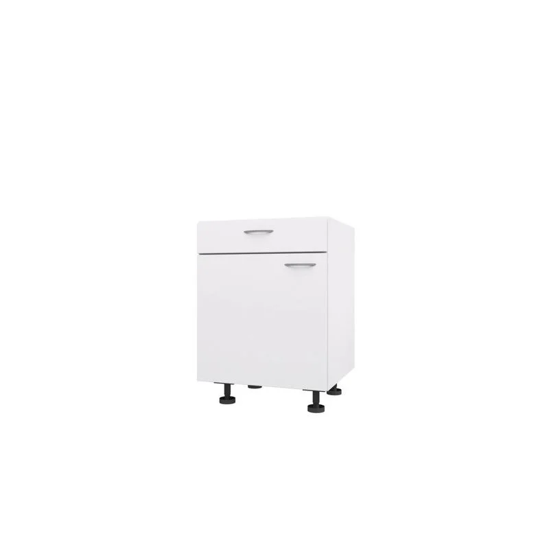 Een gootsteenkast van 600mm breed, links geplaatst op plintpoten, biedt een praktische opbergoplossing voor onder de gootsteen. Deze kast is ontworpen om gemakkelijk te monteren op plintpoten en biedt voldoende ruimte om schoonmaakmiddelen, afwasmiddel en andere huishoudelijke benodigdheden op te bergen, terwijl het tegelijkertijd een nette en opgeruimde uitstraling geeft aan de keukenruimte.