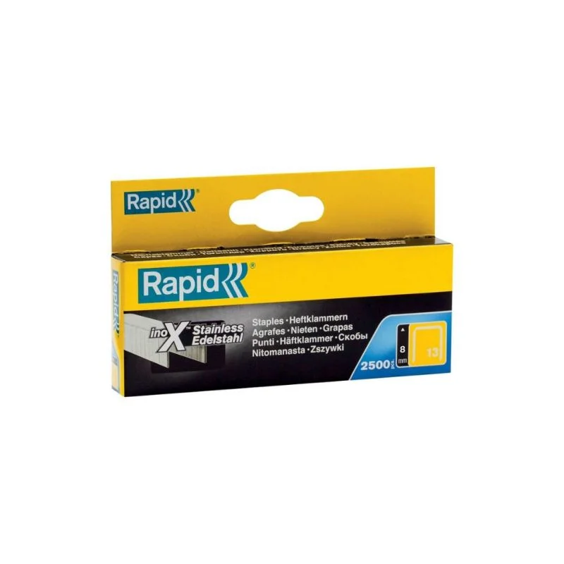 De Rapid 13\\\\/8 RVS nieten zijn ontworpen voor toepassingen die een iets langere niet vereisen. Met een lengte van 8mm bieden ze een sterke grip en een roestbestendige afwerking, wat ze ideaal maakt voor zowel binnen- als buitengebruik. Deze nieten zijn geschikt voor Rapid tackers en zijn perfect voor het bevestigen van stoffen, dunne houten panelen en lichte isolatie. De verpakking bevat 2500 stuks, wat zorgt voor een ruime voorraad.
