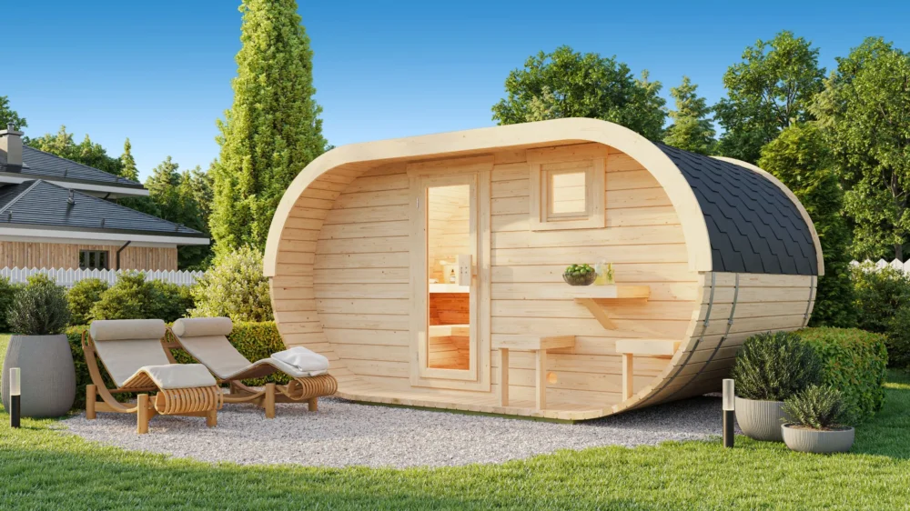 De Barrel Ovaal is een bijzondere buitensauna van vurenhout die direct in het oog springt door zijn ovale barrelvorm. Deze vorm zorgt niet alleen voor een efficiënte warmtecirculatie maar geeft de sauna ook een unieke uitstraling in de tuin. Verkrijgbaar in diverse uitvoeringen zoals een compacte standaardversie, een variant met terras, een uitvoering met twee kamers of zelfs een model met twee kamers en terras. Zo stem je de sauna eenvoudig af op jouw wensen en ruimte. Een stijlvolle keuze voor wie functionaliteit en design wil combineren.