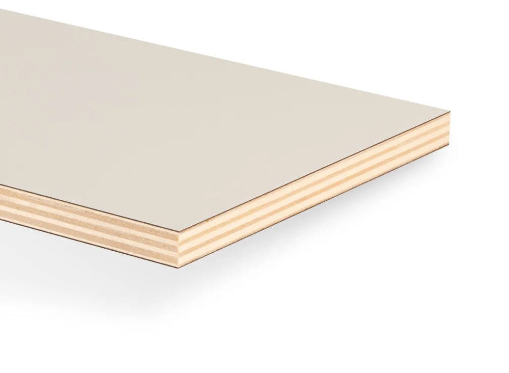 De boven- en onderzijde van de plaat zijn voorzien van een slijtvaste witte HPL. Het HPL is voorzien van een subtiele TST-structuur, ook wel sinaasappelstructuur genoemd. Deze lichte oppervlaktestructuur zorgt niet alleen voor een mooie, matte uitstraling, maar maakt de plaat ook minder gevoelig voor vingerafdrukken, lichte krassen en andere kleine beschadigingen. HPL is gemakkelijk schoon te houden en stootvast.
