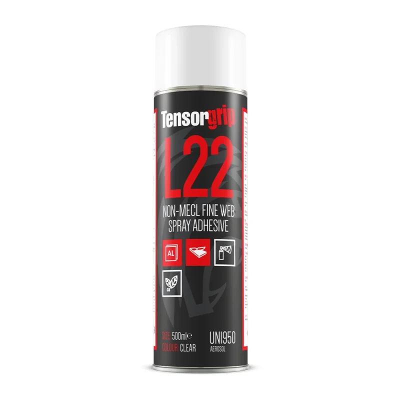 De alleskunner TensorGrip spuitlijm L22 heeft een hoge temperatuurbestendigheid, zeer hoge aanvangskleefkracht en hoge vaste stoffen gehalte. Daarnaast is deze spuitlijm vrij van chloorhoudende oplosmiddelen. Hiermee is de TensorGrip L22 niet alleen een milieubewuste lijmkeuze voor standaard toepassingen, maar ook voor verlijmingen die hogere eisen aan de lijm stellen.