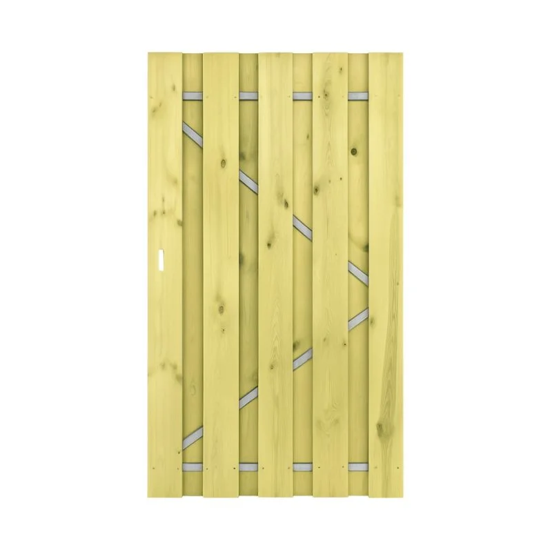 Deze tuindeur van 120x190cm is opgebouwd uit een stalen frame, afgewerkt met groen geïmpregneerde grenen houten planken. Dankzij het stevige frame biedt de deur een solide basis die langdurige stevigheid garandeert, ook bij intensief gebruik of wisselende weersomstandigheden. Het staal zorgt ervoor dat de deur recht blijft en minder snel kromtrekt, wat bij volledig houten deuren soms het geval kan zijn.Aan het stalen frame zijn bevestigingspunten gemaakt waarop je eenvoudig de meegeleverde verstelbare ogen kunt monteren. Deze ogen maken het mogelijk om de deur perfect af te stellen op de bijgeleverde plaatduimen. Hierdoor hangt de deur altijd netjes en kun je deze indien nodig gemakkelijk bijstellen voor een goede sluiting, ook na verloop van tijd.De grenen planken die op het frame zijn gemonteerd, zijn groen geïmpregneerd. Dit betekent dat ze beter bestand zijn tegen vocht, schimmel en insecten, wat zorgt voor een langere levensduur. De uitstraling van deze planken komt overeen met die van onze standaard groen geïmpregneerde grenen tuinschermen. Zo creëer je eenvoudig één mooi geheel in je tuin wanneer je deze tuindeur combineert met een bijpassende schutting.Let op: het slot wordt niet standaard meegeleverd en dient apart te worden besteld. Kortom, deze deur is een praktische en duurzame oplossing voor jouw tuin of erfafscheiding, waarbij uitstraling en functionaliteit hand in hand gaan