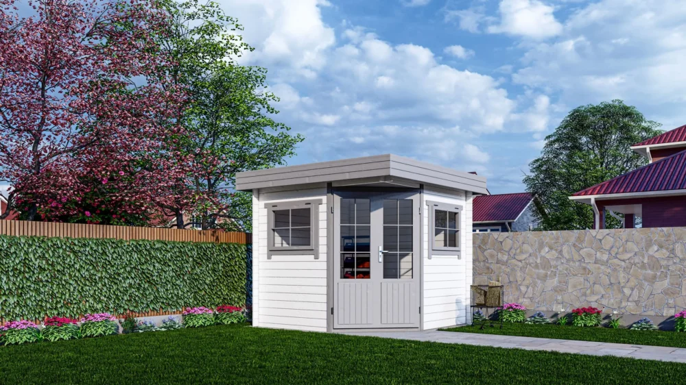 - Tegen meerprijs wordt de blokhut voorzien van een 2-laagse behandeling van de wanden aan buiten- én binnenzijde, de dakplanken/-delen 1-zijdig en de deuren en ramen 2-zijdig.
