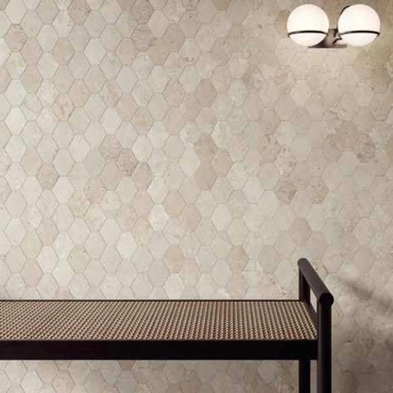 Crossland geeft een opvallend realistisch effect in zowel kleur als textuur van natuursteen. Deze collectie is verkijgbaar in vier unieke kleuren, versterkt door mozaïeken en 3D decoraties. De hexagon tegels zijn verkrijgbaar per doos van 6 matjes. \\u20AC 25,= per matje.
