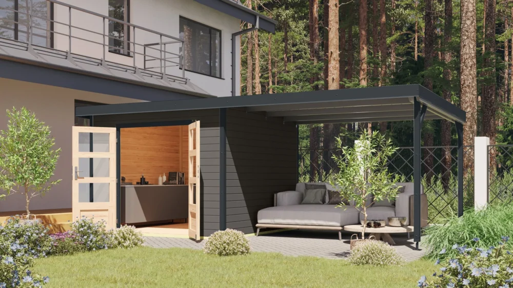 Veilige Betaling Karibu 97911 Pluto 6 tuinhuis met overkapping – terragrijs|antraciet