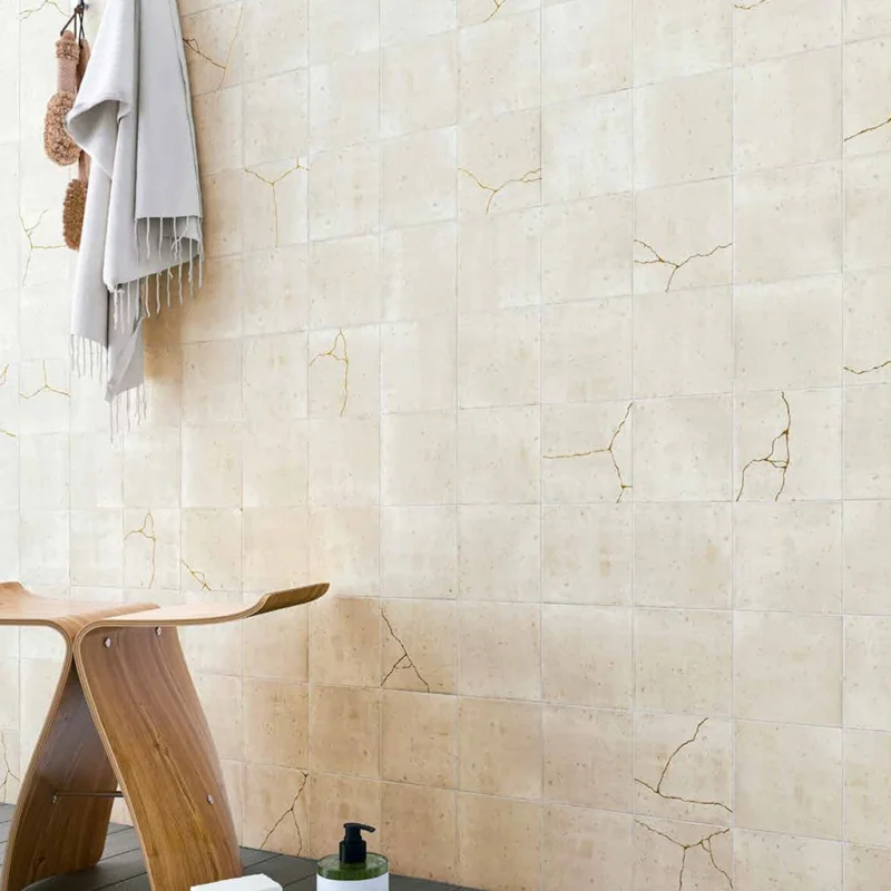 Nakama, met de decors Wabi en Kintsugi, weerspiegelt rustieke eenvoud, serene stilte en de schoonheid van imperfectie die een tijdloze elegantie creëert. Karui en het decor Suki combineren juist glans, frisheid en traditie met de warme uitstraling van de natuur. Deze collecties vinden hun spirituele verbinding in Ens\\u014D, een eeuwenoud symbool uit het Zenboeddhisme dat staat voor de cirkel van verlichting, elegantie en leegte. Getekend in één enkele, doordachte penseelstreek, vangt het Ens\\u014D de essentie van zijn maker en belichaamt het minimalisme en volmaakte balans. Samen brengen deze ontwerpen harmonie tussen eenvoud en verfijning, perfect voor een tijdloze en sfeervolle inrichting. Kintsugi is voorzien van delicate goudkleurige ader en heeft 20 verschillende patronen welke willekeurig zijn gemixt in een doos. DEZE TEGEL IS TE BEZICHTIGEN IN ONZE SHOWROOM. Afname per doos van 36 tegels (0,556 m\\u00B2) \\u00E0 \\u20AC 8,95 per tegel.