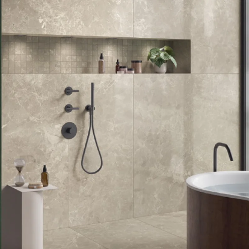 Cosmopolitan is een natuursteen look tegel met een subtiele marmer structuur. De collectie bestaat uit 6 kleuren en diverse formaten. Deze tegel is te bezichtigen in onze showroom.