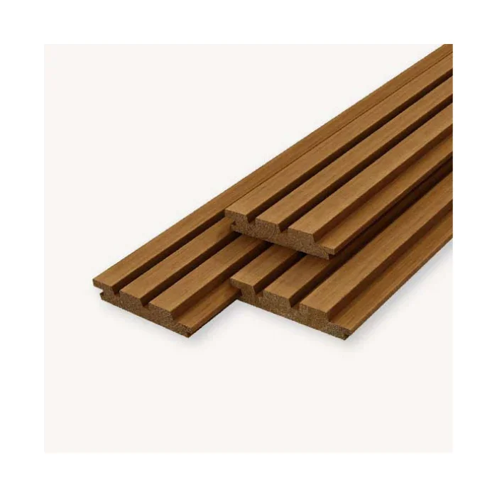 Thermisch gemodificeerd vuren hout met drievoudig profiel voor een eigentijds, strakke wand- en gevelafwerking. Geschikt voor binnen- en buitentoepassingen waar stabiliteit en een moderne uitstraling gewenst zijn.