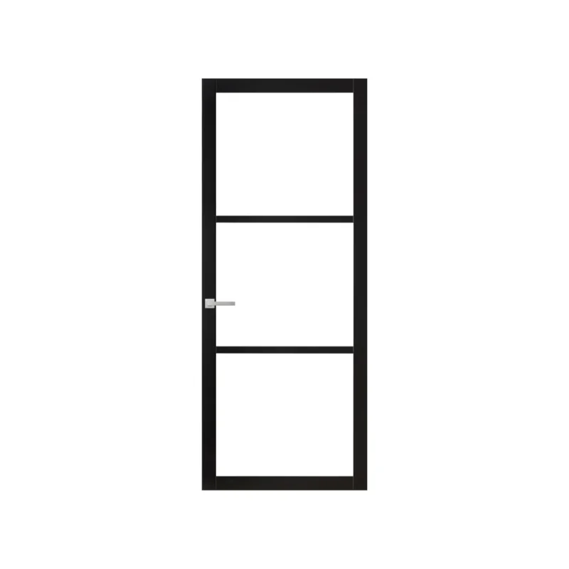Industrieel design binnendeur. 3-ruits model met minimalistisch 80 mm frame. Basis van hout, schitterende steel look. Dit model is voorzien van een infrezing ten behoeve van een smaldeurslot.
