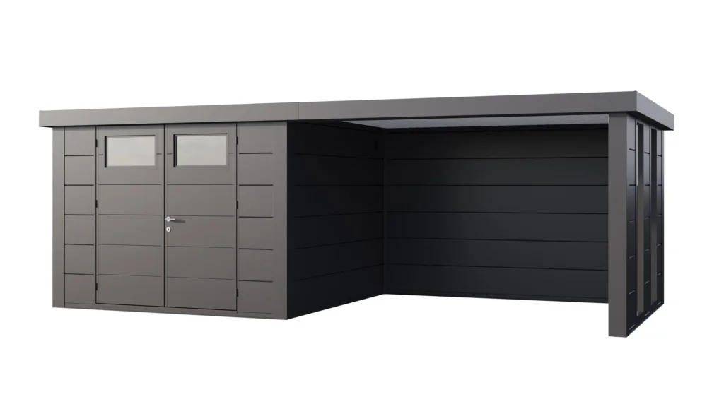 De Classico met lounge van Telluria is een luxe metalen tuinhuis. Het tuinhuis is ideaal voor het opbergen van gereedschap, fietsen of om er een klusruimte van te maken. De ruime overkapping zorgt voor de ideale plek om onder te ontspannen en zo heel het jaar door van je tuin te genieten. De twee vaste ramen in de overkapping zorgen voor extra lichtinval en een meer open gevoel.