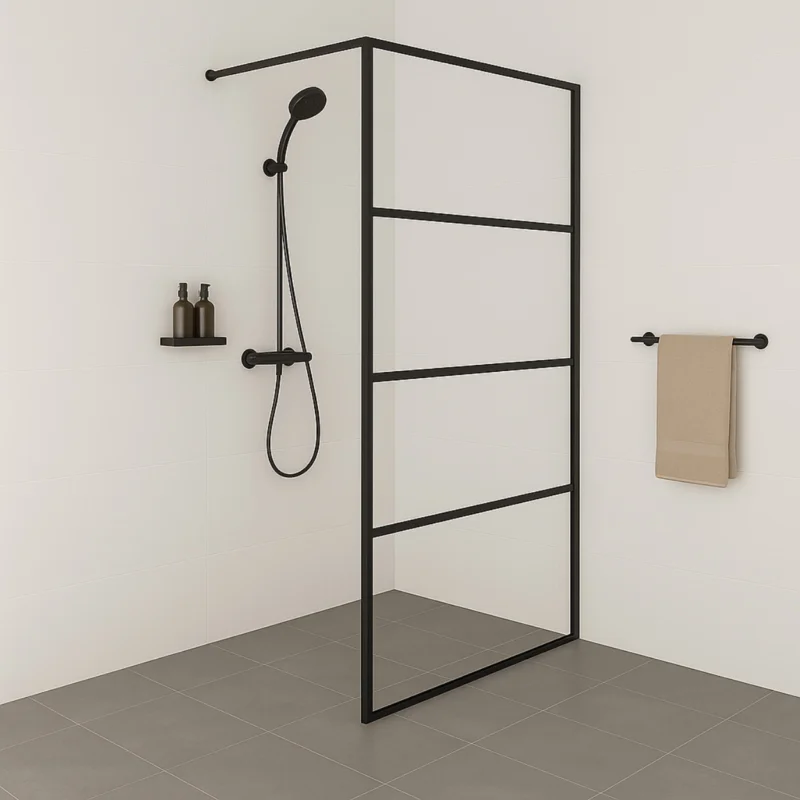 De Wiesbaden Horizon douchewand is een ware blikvanger voor je badkamer. Het heldere glas is voorzien van een stijlvol mat zwart raster, dat horizontaal over de hele wand doorloopt. Het geeft een krachtig, industrieel karakter én behoudt een ruimtelijk gevoel. De wand is per afmeting verstelbaar, waardoor je hem perfect kunt laten aansluiten op jouw ruimte.