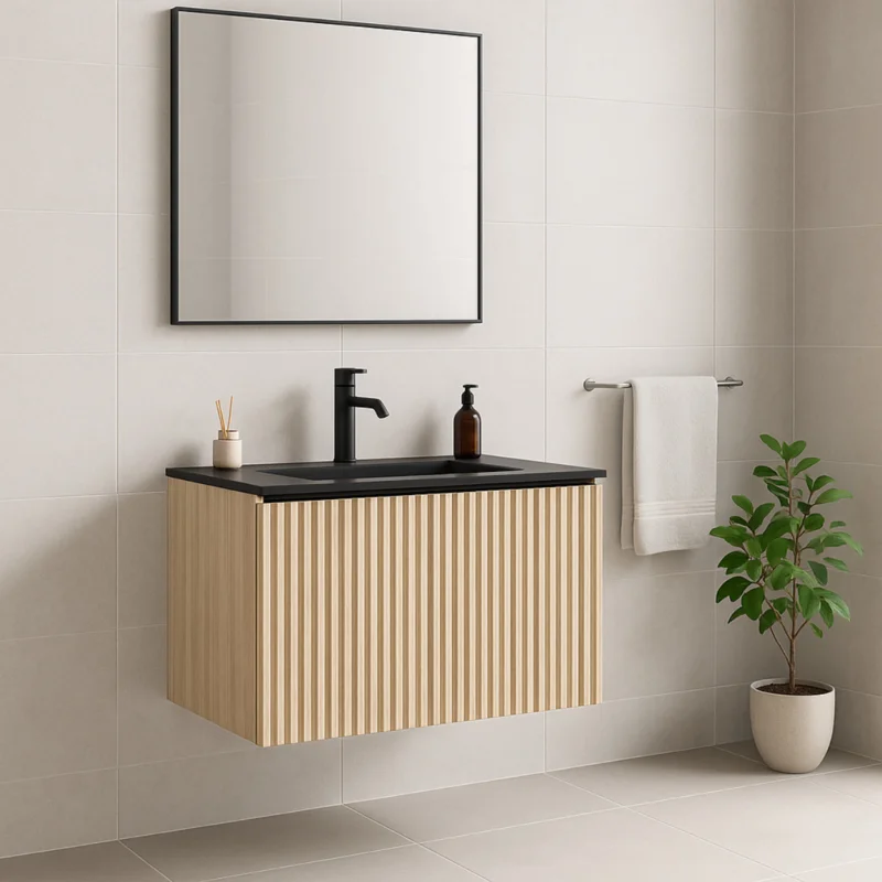 Het Ribbella badmeubel combineert stijl, warmte en functionaliteit in één ontwerp. De natuurlijke houtlook van de onderkast en de mat zwarte marmerlook wastafel zorgen samen voor een moderne, tijdloze uitstraling \\u2013 een echte eyecatcher in elke badkamer!