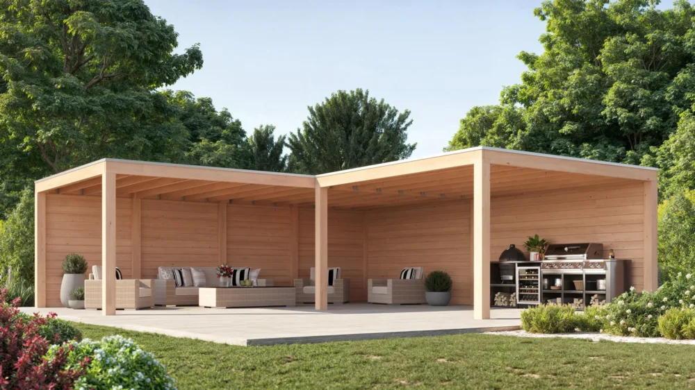 Zoek je meer dan alleen een standaard overkapping? Dan is de Moonstone Essential hoek model de ideale keuze. Het frame van fijnbezaagd Douglashout met slanke staanders van 15×15 cm zorgt voor een strakke en moderne uitstraling. De unieke L-vorm van dit model biedt verschillende mogelijkheden met de indeling. Zoals de Moonstone waarbij we met verschillende wanden een beschutte lounge plek creëren.