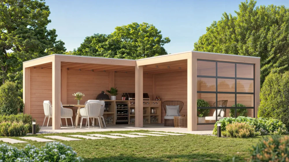 Zoek je meer dan alleen een standaard overkapping? Dan is de Onyx Excellent hoek model de ideale keuze. Het frame van geschaafd Douglashout met robuuste staanders van 19×19 cm zorgt voor een strakke en moderne uitstraling. De unieke L-vorm van dit model biedt verschillende mogelijkheden met de indeling. Zoals de Onyx waarbij we met verschillende wanden een beschutte lounge plek creëren, de glaswand zorgt dan ook voor bescherming van de elementen maar zorgt voor extra licht inval en een gevoel van ruimte.